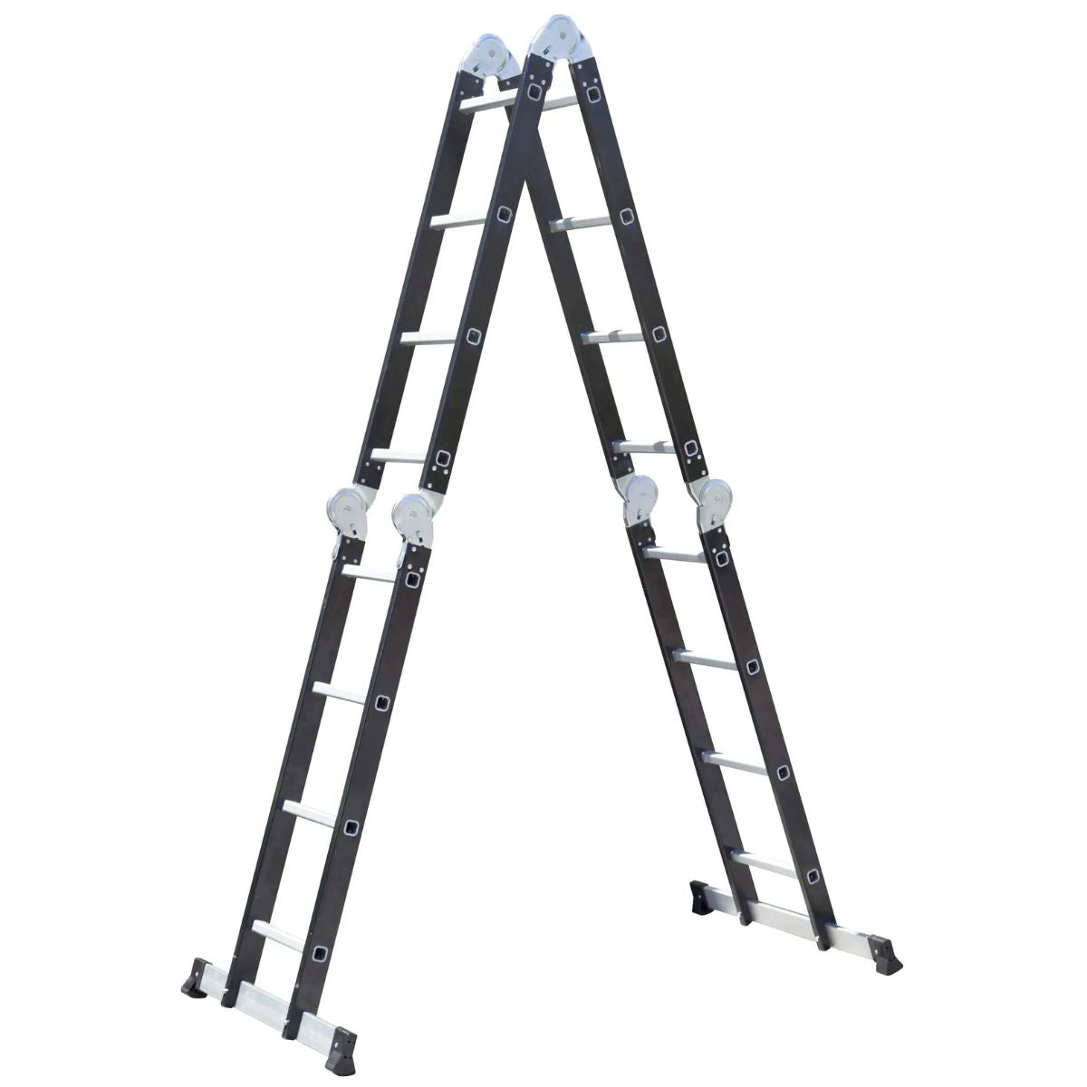 Die Escalo Multifold 2-in-1-Klappleiter ist eine multifunktionale und kompakte Lösung für Arbeiten im und ums Haus. Dank sechs automatisch verriegelnder Scharniere lässt sich die vierteilige Leiter sicher in A-Stellung oder als Anlegeleiter verwenden. Ausgestattet mit zwei breiten Stabilitätsstreben mit rutschfesten Füßen bietet die Multifold stets optimale Stabilität und Sicherheit. Das schwarz eloxierte Aluminium verhindert schmutzige Hände und Korrosion, während das klappbare Design die Leiter leicht zu verstauen und zu transportieren macht.