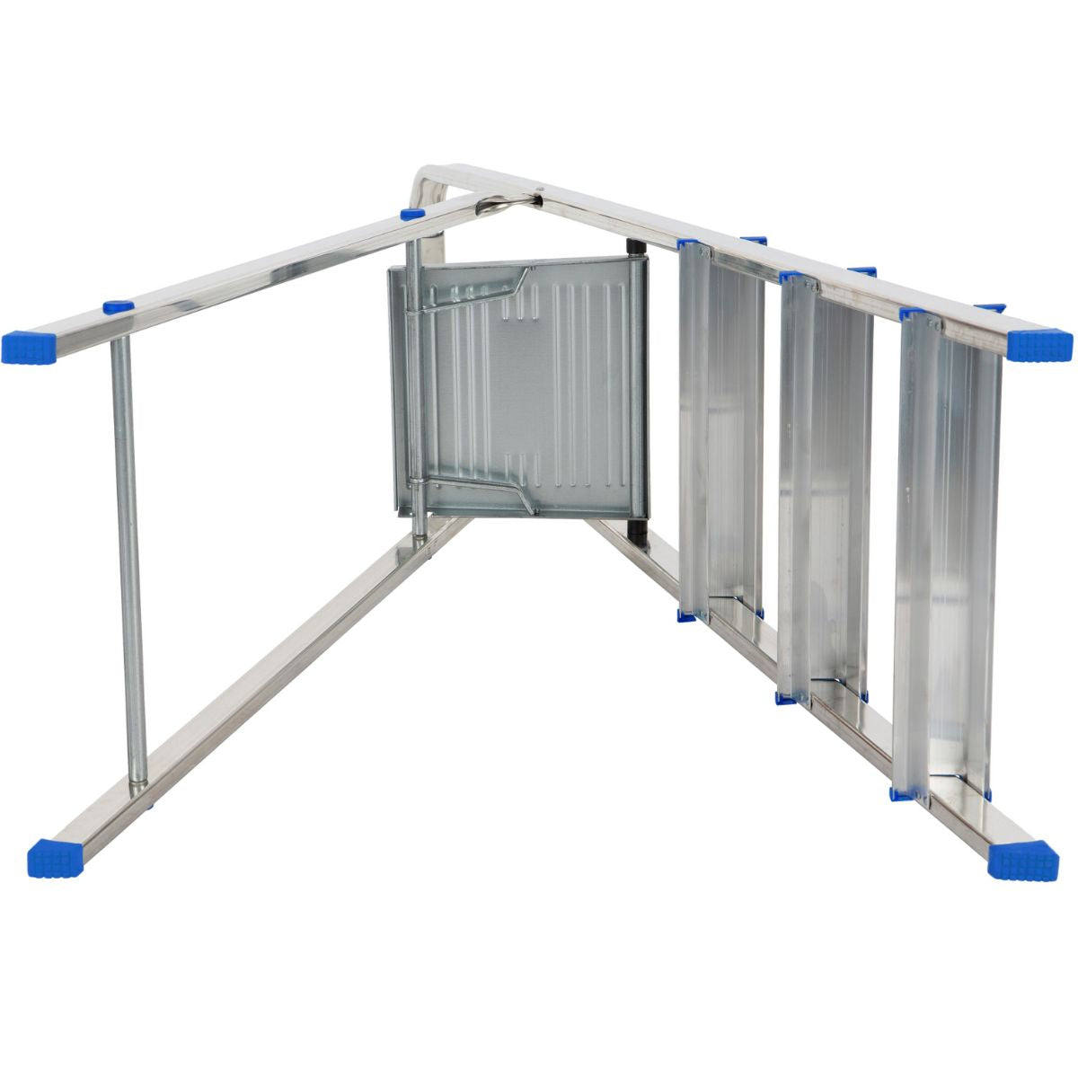 De Easy Step trap heeft een uitgeklapte hoogte van 153 cm en een slim ontwerp dat opgevouwen slechts 11 cm diep is. Daardoor berg je hem eenvoudig op in een kast of hoekje. De stevige antislipvoetjes zorgen ervoor dat de trap niet verschuift, ook niet op gladde vloeren. Bovendien is hij dankzij het lichte aluminium frame moeiteloos te verplaatsen van kamer naar kamer.