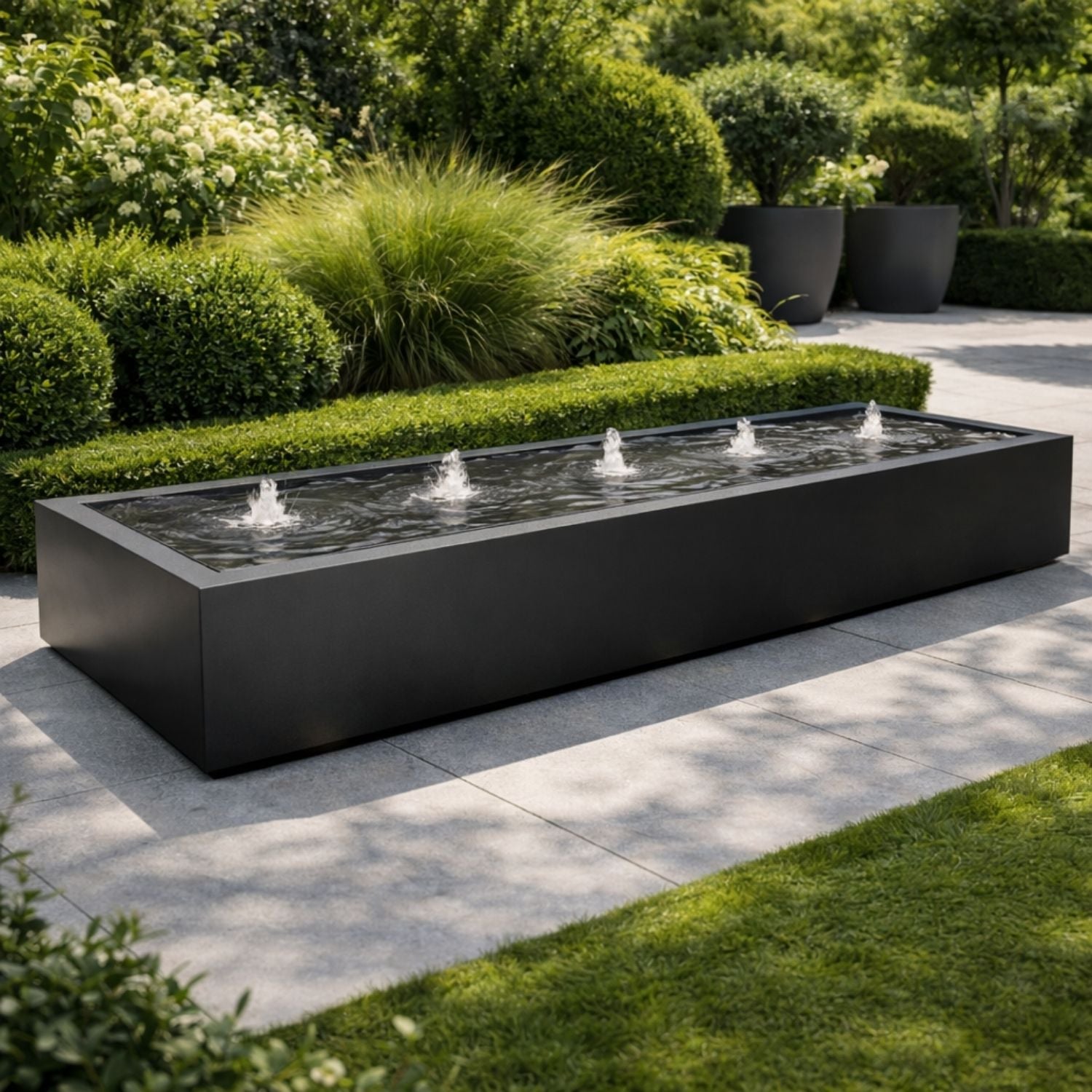Nuestras mesas de agua son una decoración única para jardines. Sus líneas rectas y modernas aportan un ambiente elegante y dinámico a cualquier espacio exterior. La Geroba Taula mesa de agua rectangular de aluminio 400x100x40 cm 103 kg se integra perfectamente entre la vegetación y, gracias a la bomba y a las fuentes con iluminación LED incluidas, podrás disfrutar también de noche del relajante efecto del agua en movimiento.