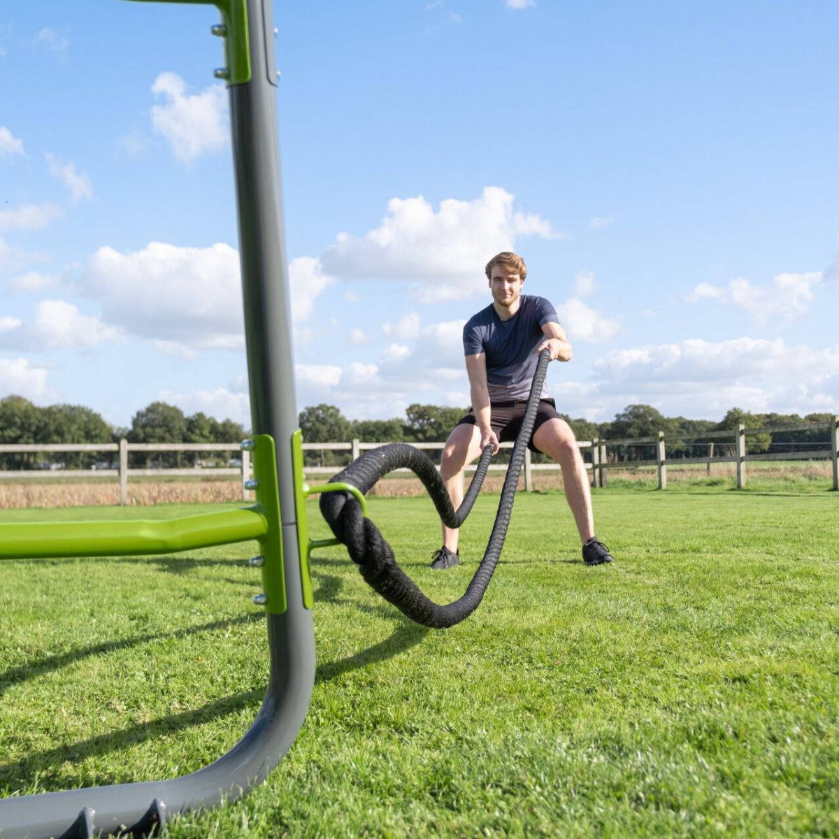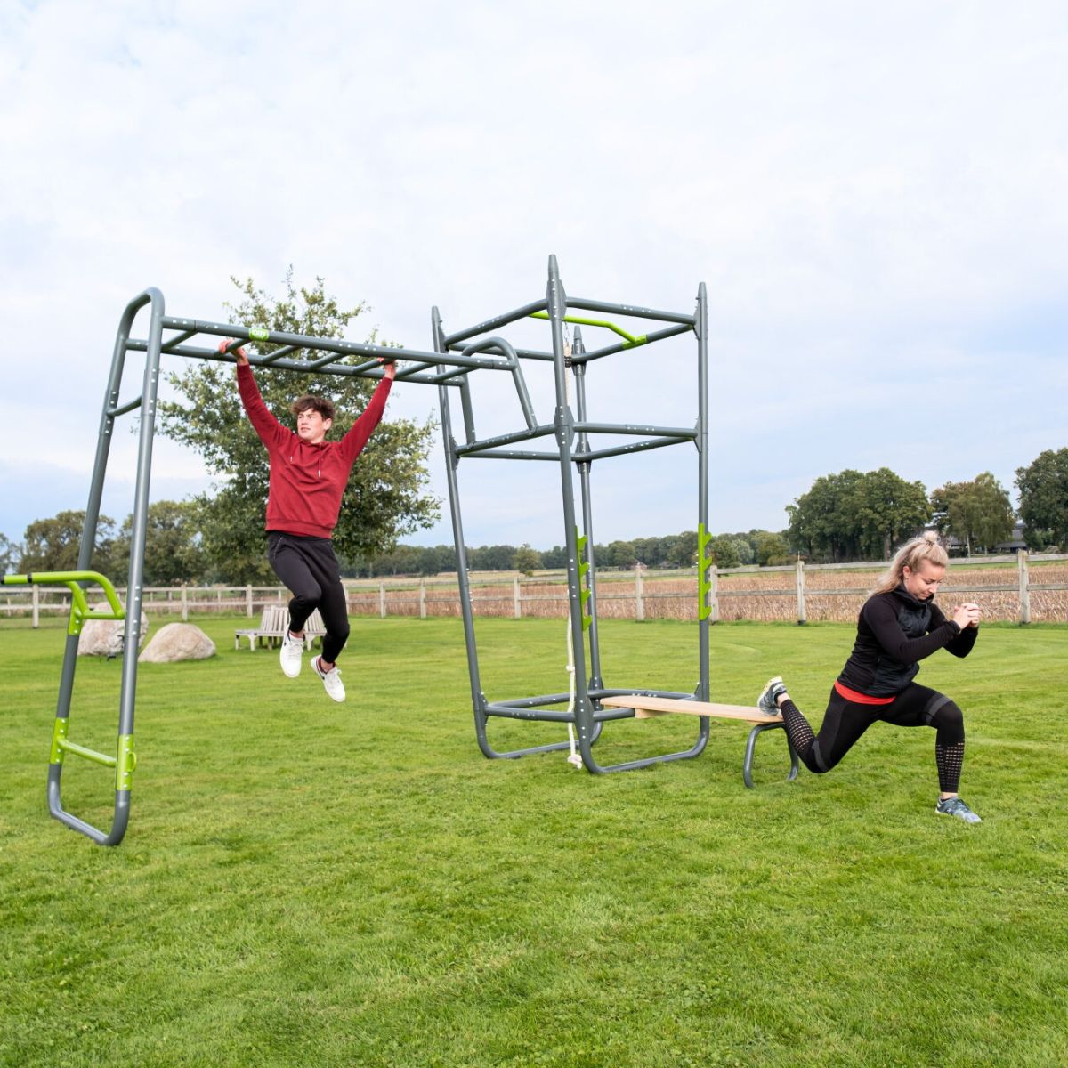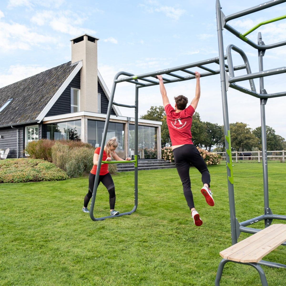 El marco está acabado en un gris antracita intenso, combinado con lujosos detalles verdes en los accesorios deportivos. Esto le da a la GetSet PS510 un aspecto moderno y profesional que se integra a la perfección con cualquier estilo de jardín. Funcionalidad y diseño se unen en un dispositivo que vale la pena presumir. Tu solución integral de fitness Con la EXIT GetSet PS510, obtienes más que un simple dispositivo: inviertes en un estilo de vida deportivo para ti y tu familia. Entrena de forma funcional, variada e intensiva cuando quieras, sin compromisos. ¡GetSet, ejercítate y diviértete juntos!