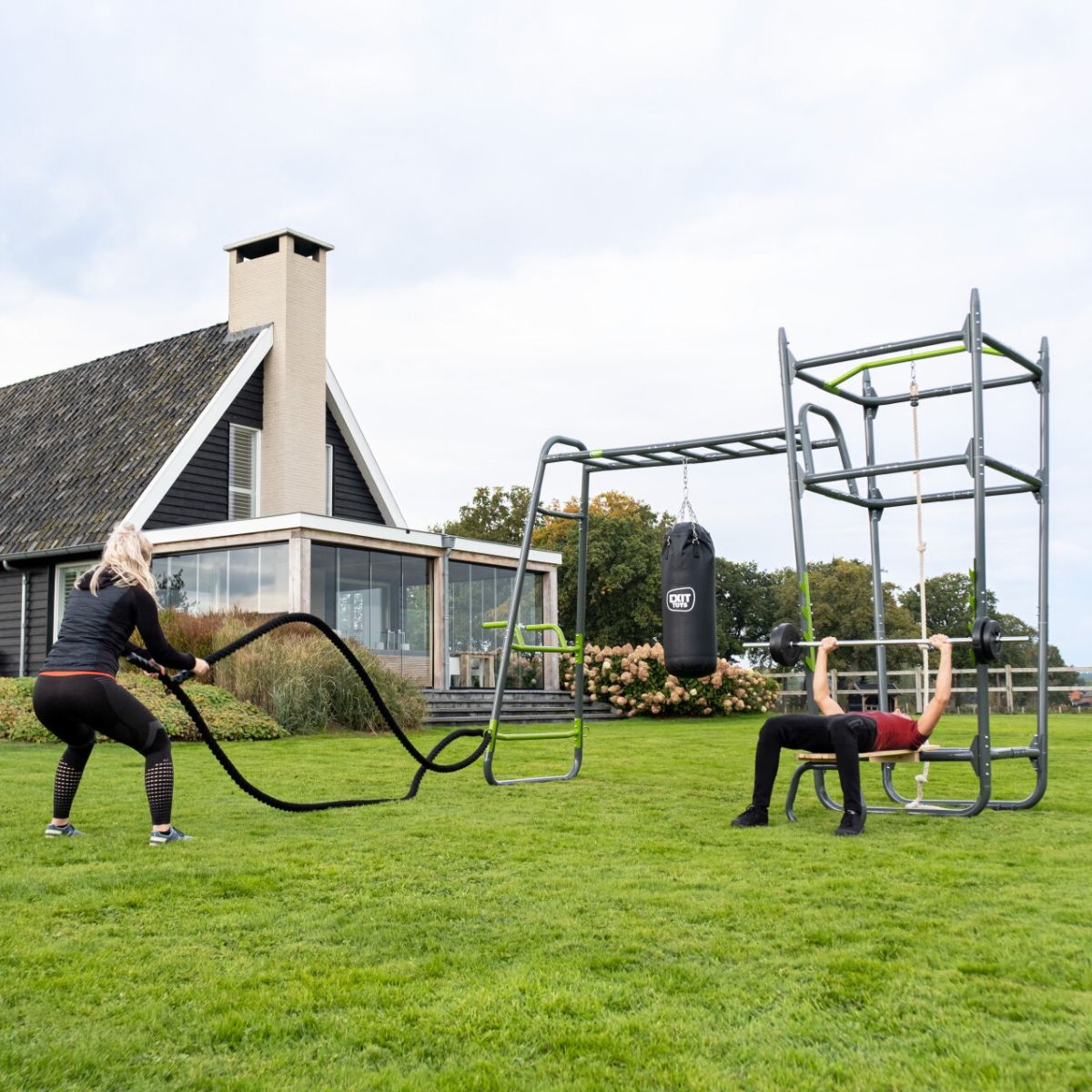 ¿Buscas una solución completa y elegante para ejercitarte en tu jardín? El EXIT GetSet PS510 es un rack de fitness multifuncional para exteriores de más de cuatro metros de largo, especialmente diseñado para personas activas mayores de 14 años y adultos. Gracias a los ocho accesorios incluidos, como un saco de boxeo, un banco de fitness, soportes para barra y una cuerda de escalada, puedes construir fácilmente tu propio gimnasio al aire libre. Entrena solo, en familia o con amigos, cuando te convenga. Entrenamiento completo al aire libre, en casa Para cualquier momento del día Tanto si tienes media hora libre entre actividades como si quieres entrenar por la noche mientras los niños duermen, el PS510 siempre está listo para ti. Sin desplazamientos ni suscripciones, una estación de fitness completa en tu jardín. Y gracias a su diseño versátil, también puedes animar a tus hijos adolescentes a alejarse de la pantalla y participar en actividades deportivas al aire libre.