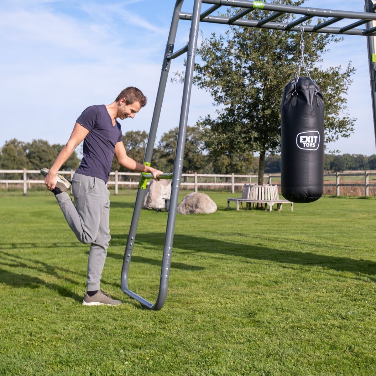 Con la PS520, puedes hacer press de banca, dominadas, flexiones, fondos, elevaciones de piernas colgado e incluso boxeo sin esfuerzo. El rocódromo integrado ofrece un reto extra y fortalece todo el cuerpo. ¿Quieres aún más variedad? Simplemente añade accesorios EXIT GetSet, como anillas de gimnasia de plástico para entrenamiento de fuerza inestable con tu propio peso corporal. ¿Y quieres usar la barra de mono? Retira el saco de boxeo y entrena específicamente la fuerza de agarre, la coordinación y los músculos del tren superior.